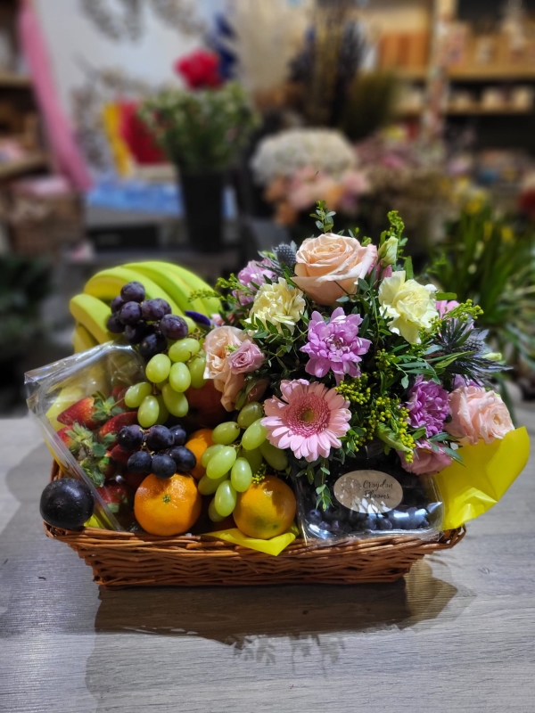 • fruits and flowers hamper basket avaiable for same day delivery in Croydon, South London, arranged by local florist
