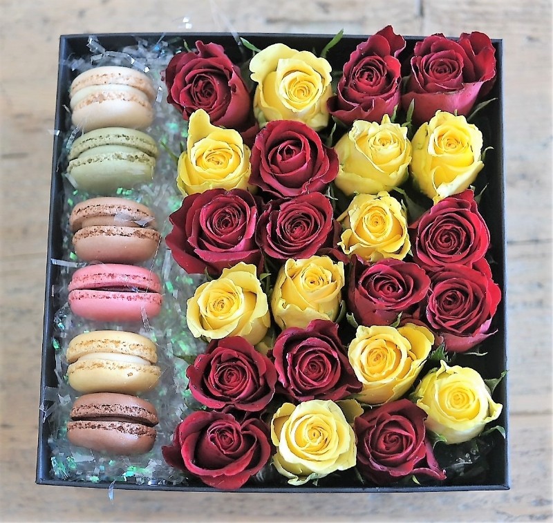 & yellow roses. The hat box is
