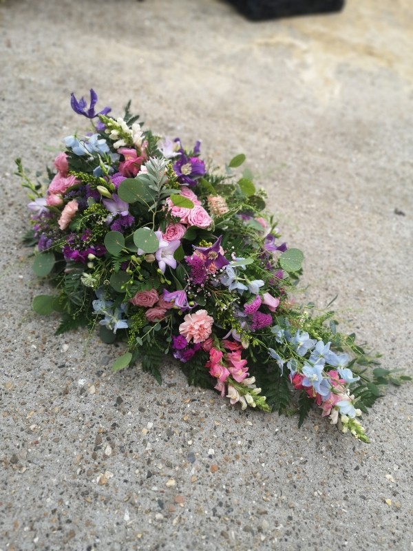 Gorgeous teardrop spray in pink, lilac and purple to include lilac roses, purple lisanthus, green viburnum, pink spray roses, twigs and fillers.