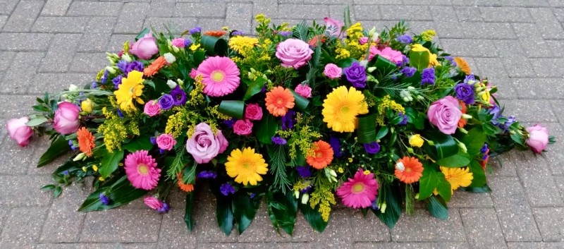 A vibrant coffin spray which would typically include yellow roses, orange geminies, purple iris, delphinium, thilaspi, cerise roses and seasonal foliage. All colours and variations can be of course personalised.
