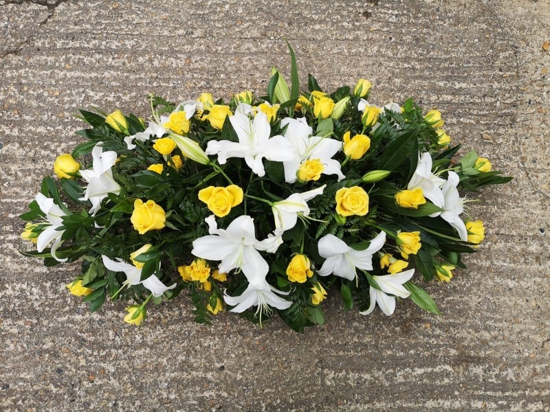 White Lily and Yellow Rose coffin spray with complimentary foliage.