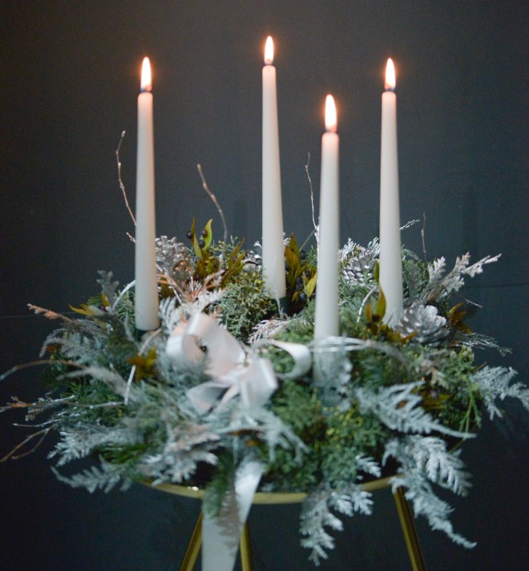Lovely 12 inch Christmas Bliss table Wreath made of fresh spruces and silver asparagus and pines, cinnamon and white candles