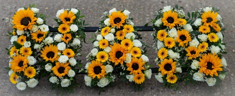 Beautiful bright funeral tribute to include mini sunflowers and yellow daisies with white lysanthius and spray roses.