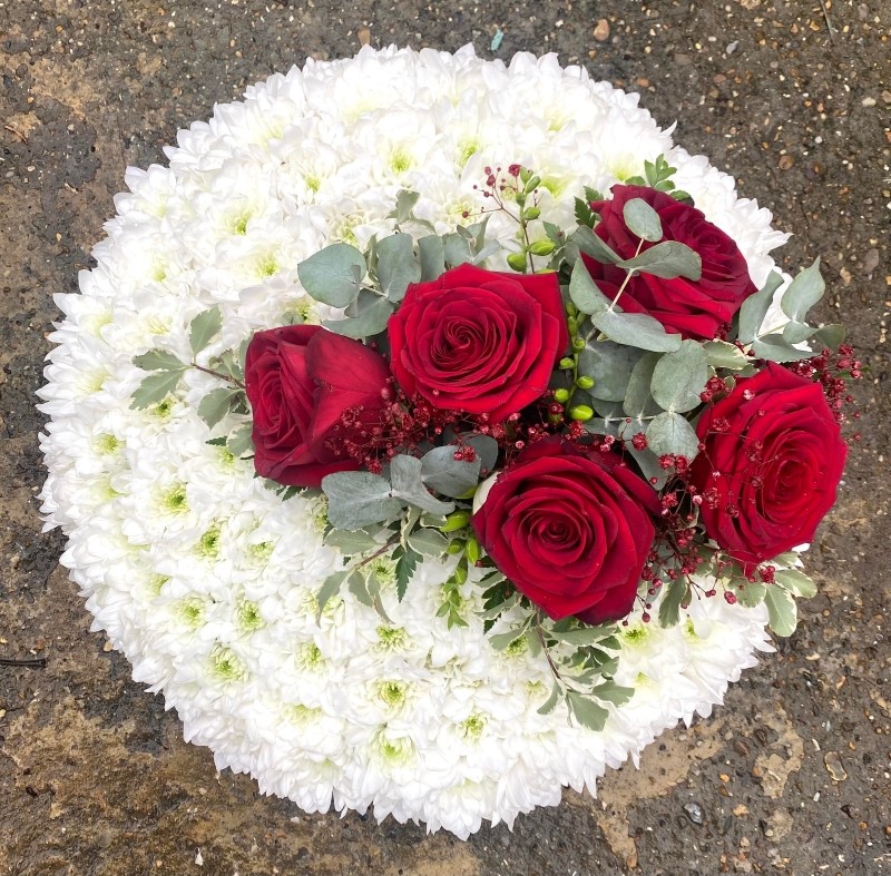 Chrysanthemum based funeral posy pad with white ribbon and red rose spray.