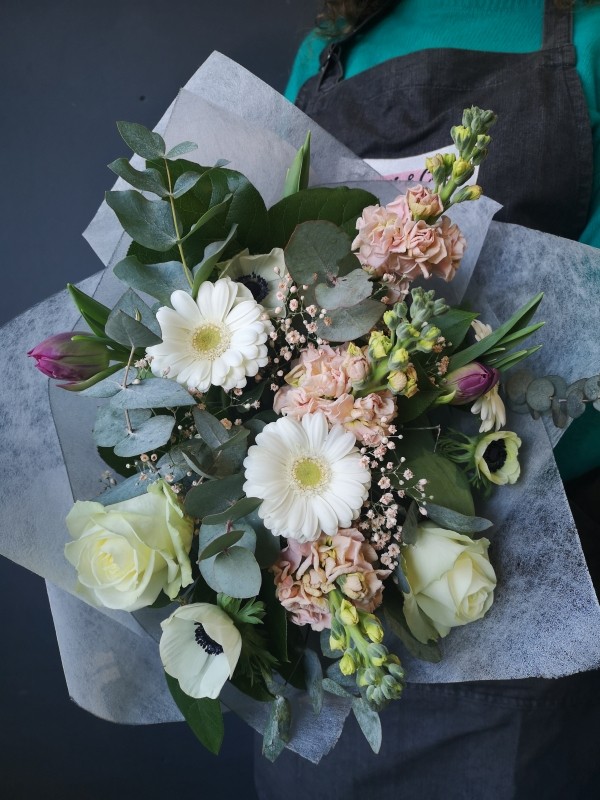 Selection of scented stock, anemones, roses and seasonal fillers and foliage. Sophisticated gift.
