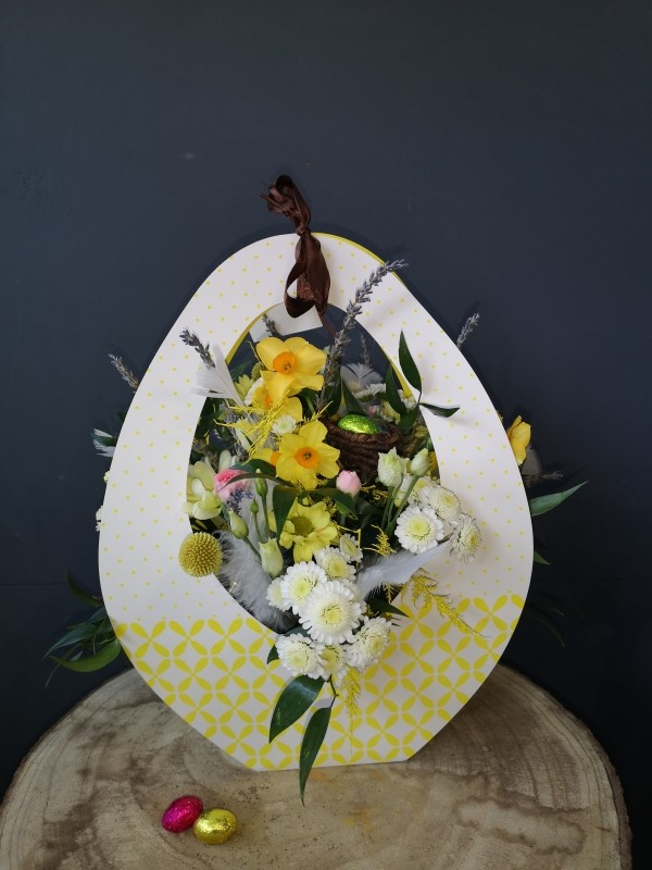 Easter Egg arrangement made of mix yellow and white flowers to include nest with chocolate eggs.