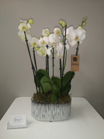 White phanelopsis orchids oval, ceramic planter. Lovely, elegant gift.