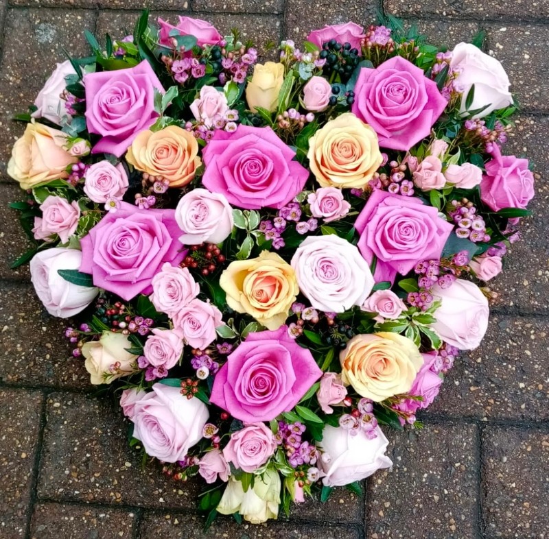 • mixed pastels solid roses funeral heart by Croydon Blooms