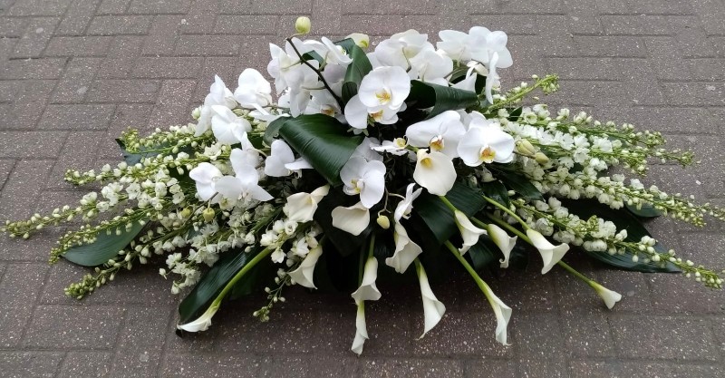 Stunning all white Casket spray specifically design for the American style casket top.