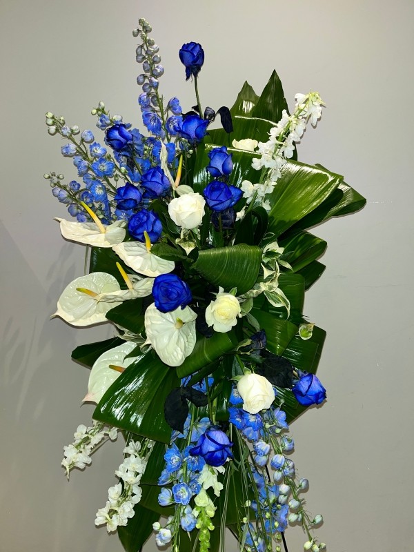 Modern Contemporary Standing spray to include roses, anthuriums, delphiniums or gladioli, aspidistria leaves.