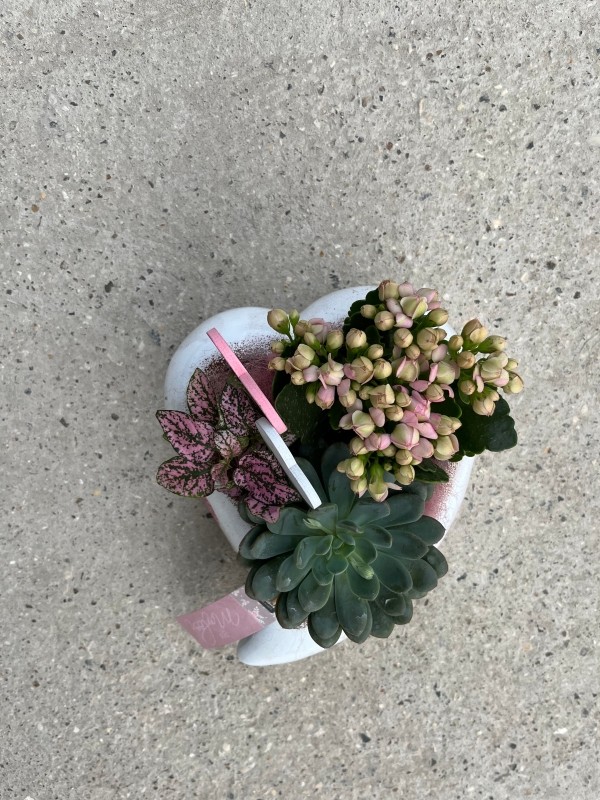 Such a cute and long lasting gift made of planted kalanchoe and succulents in heart shaped ceramic planter.