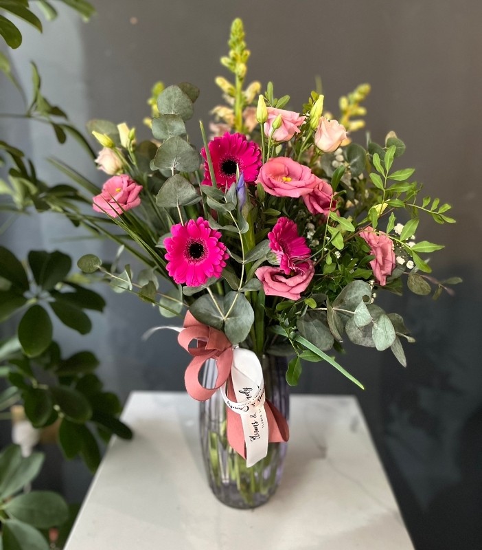 Mixed pinks flowers lilac vase. Stunning easy to maintain gift.