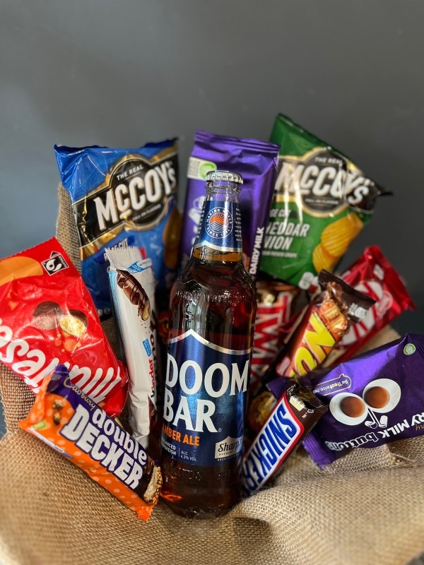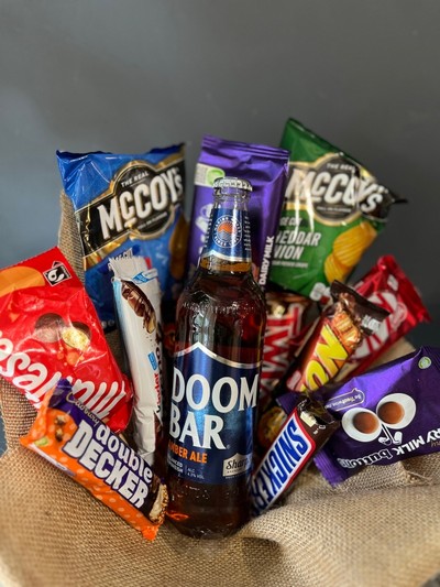 craft beer, cadbury chocolate bar, kit kat bar, twix bar, snickers bar, random 2 packs of Crisps McCoys, maltesers, lion bar, Kinder Bueno bar, button Cadbury pack, double decker bar.