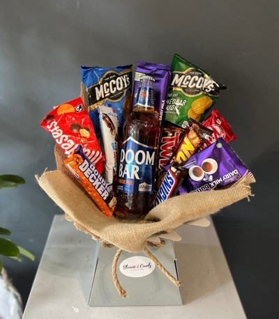 • Mix of snacks with craft beer presented in a bouquet, gift wrapped.  bouquet to include:  craft beer, cadbury chocolate bar, kit kat bar, twix bar, snickers bar, random 2 packs of Crisps McCoys, maltesers, lion bar, Kinder Bueno bar, button Cadbury pack, double decker bar. Made by florist in Croydon, Surrey, UK for same day delivery in CR0 CRO CR2 CR3 CR4 CR5 CR6 CR7 CR8 SE25 BR4 BR3 BR2