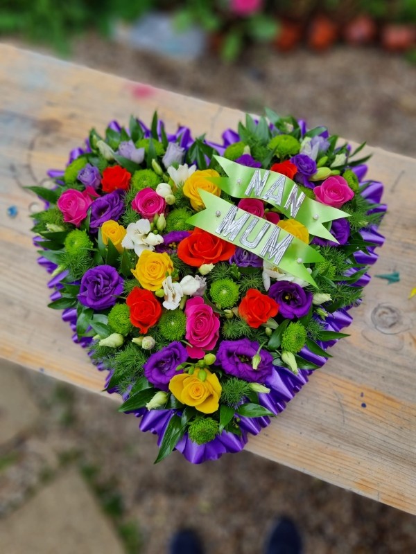 Funeral solid, full heart tribute made of deep purples, green, deep pink colours.