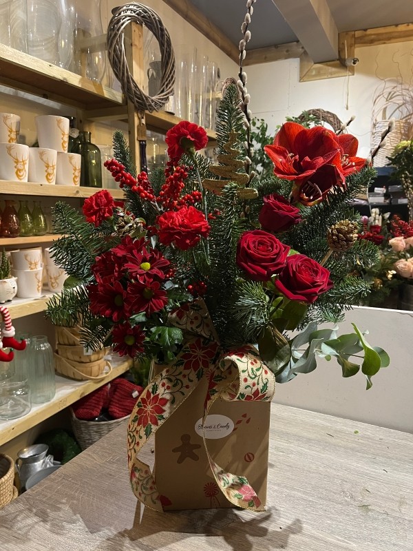 70 cm gift box arrangement to include Amaryllis, Roses, Carnations, Ilex, Pussy Willow, Eucalyptus, Pines, Blue spruce, gold tree ornaments with big hessian bow. Amazing long lasting gift to enjoy.