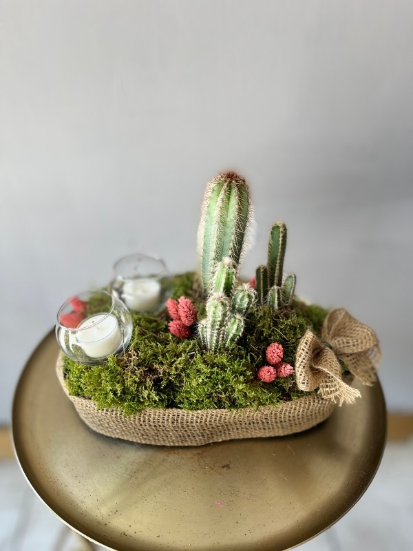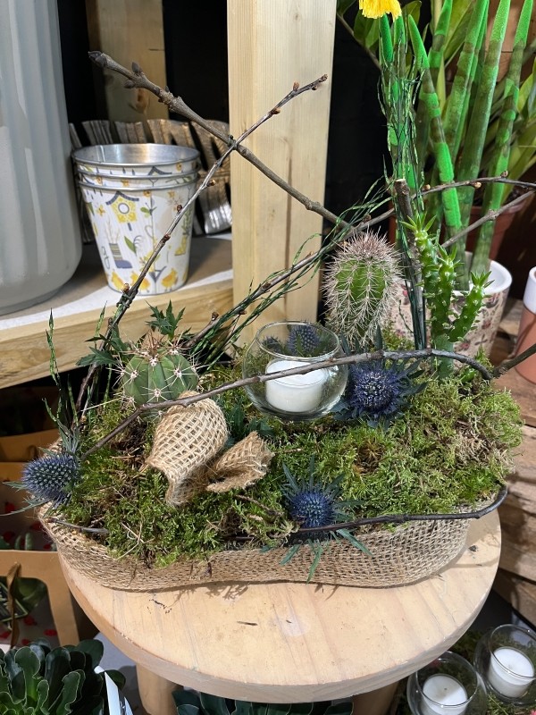 • 30cm long oval indoor planter made on moss with mini cactus with glass candle holders and decorated with dry elements.  lovely gift for a side table to enjoy for a long time.  planter will be gift wrapped in cellophane and tied with a silk bow and personal message attached. Made by florist in Croydon