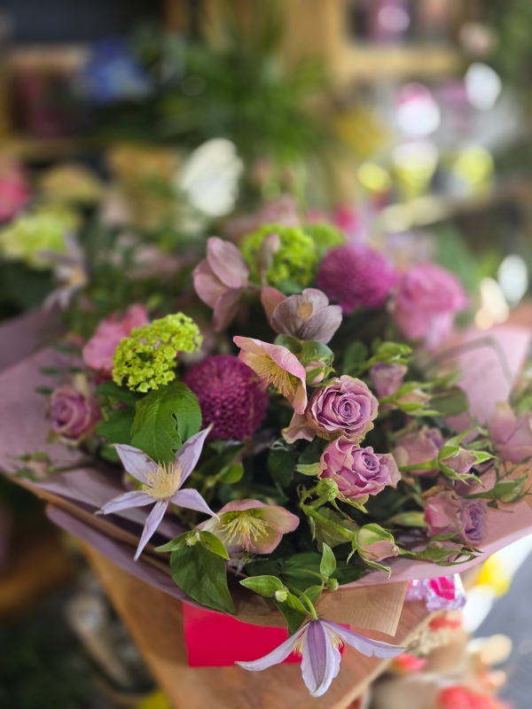 Designed by our sister branch Blooms and Candy Florist this is mixed lilac and green flowers bouquet to include lilac roses and spray roses, clematis, viburnum and complementary foliages and fillers.