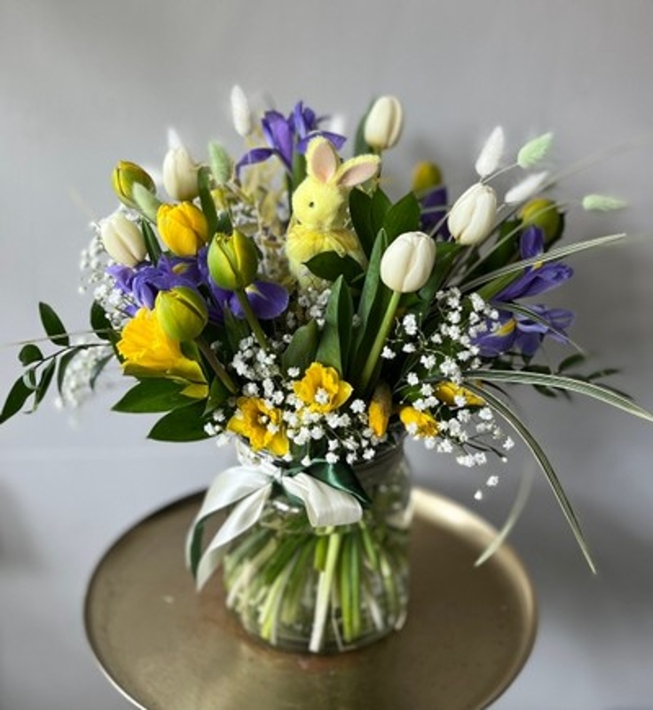 • Tulips vase woth iris and pussy willow and Easter Decorations by Croydon Florist