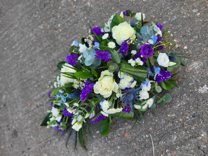 • Mixed flowers teardrop to include white roses and purple limonium, lisantuh, delphinims, thisle and eucalyptus by Croydon Blooms