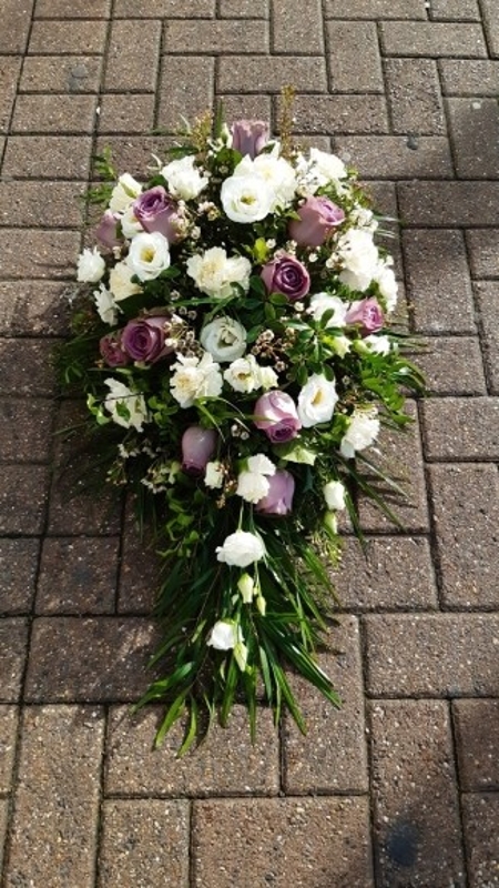• Stunning soft looking teardrop to include mixed white flowers, wax and lilac roses. By Croydon Blooms