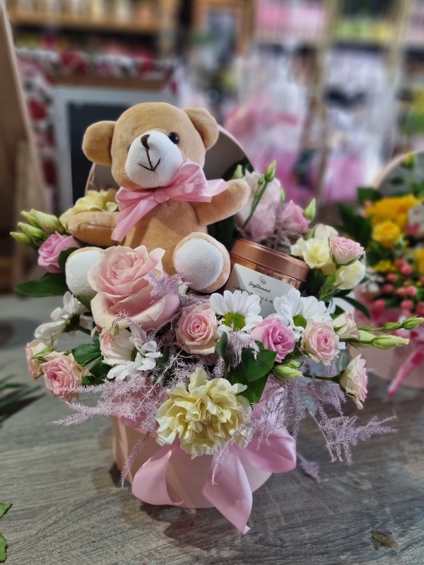 Exclusively available for Mother's Day, pink hat box with bright flowers arrangement to include soft teddy and copper soy wax candle from Daydreamer colletion.